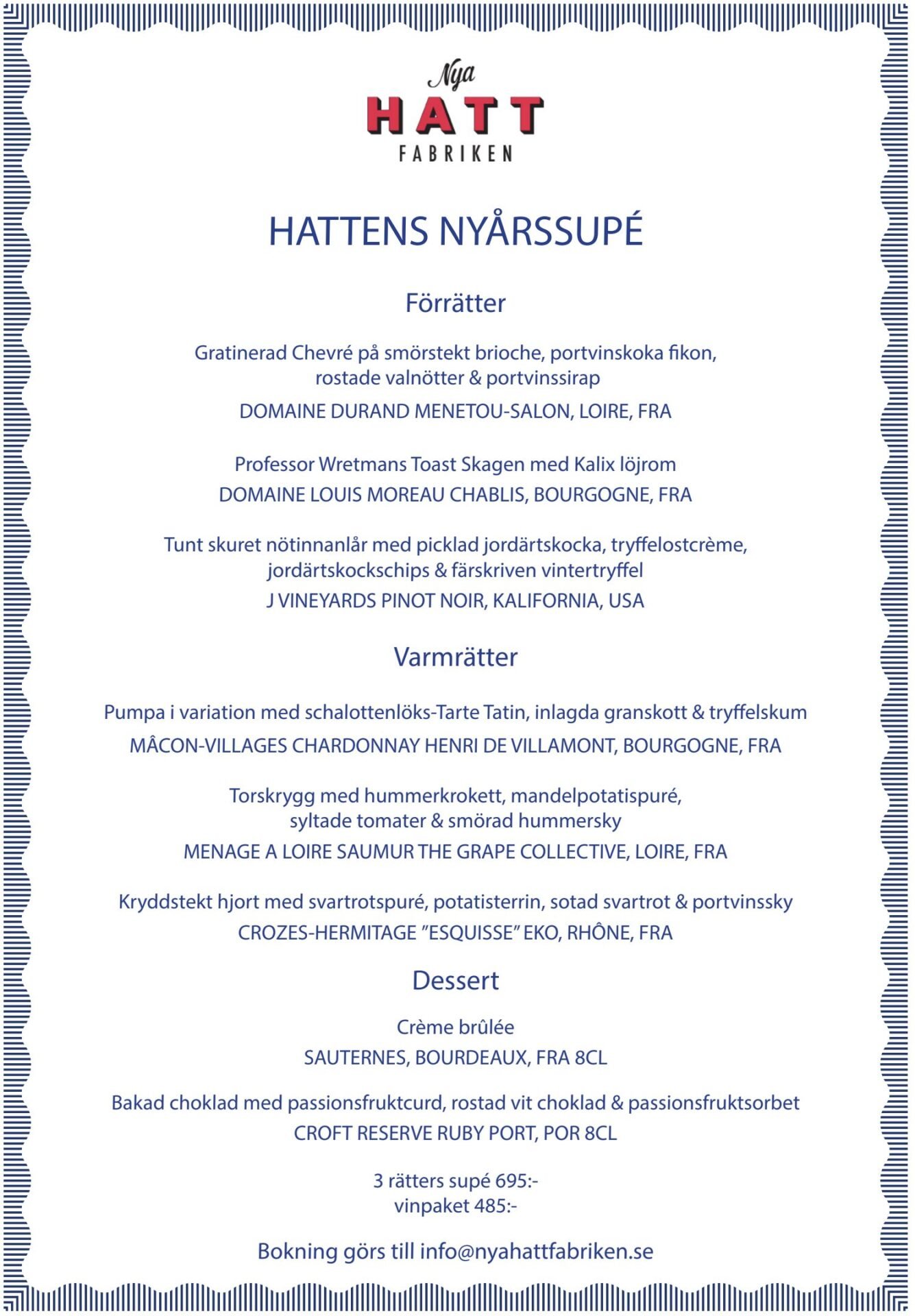 Nyårsafton bjuder på en trerättersmeny, noga komponerad för att ge dig en smakupplevelse utöver det vanliga. Kvällen kommer att fyllas av fantastisk mat, festlig stämning och goda viner – den perfekta platsen att ringa in det nya året tillsammans med familj, vänner eller någon speciell.